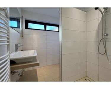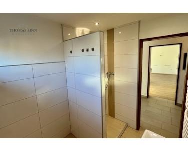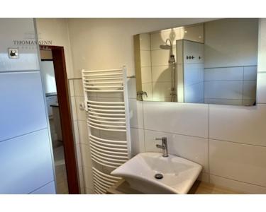 Das Badezimmer wurde bereits modernisiert und mit einer fast bodengleicher Dusche, großformatigen Wandfliesen und einem Handtuchheizkörper ausgestattet – hell, pflegeleicht und komfortabel.
