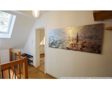 Über eine Treppe in den Flur zum Schlafzimmer sowie Gästezimmer, Bad mit Dusche/WC. Die Wendeltreppe im Flur führt zum Dachgeschoss mit Arbeitsbereich, Entspannungecke sowie Waschbereich.
