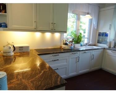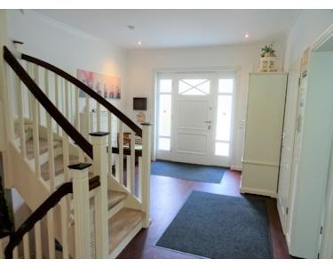Der Eingangsbereich des Hauses, der sehr großzügig gestaltet ist, führt in das erste Schlafzimmer, die Küche, ins Eßzimmer, ins Wohnzimmer, ins Gäste WC ( eines von insges. 4 WC's im Haus) oder zum Kellerabgang. Ausgelegt mit Designer Vinylplanken. Im Wohnzimmer und in der oberen Etage ist Teppichboden verlegt. Das Wohnzimmer wird geteilt durch eine Kaminwand, das die Nutzung des Kamins von beiden Seiten möglich macht. Das Esszimmer ist zur Küche offen. Eine sehr hochwertige Holzküche mit Granitarbeitsplatte, 5 er Ceran Kochfeld, Dampfgarer, Mikrowelle, Heißluftofen, Grill, Side by Side Kühl/Gefrierkombi mit Eiswürfelbereiter, Spülmaschine, gr Villeroyboch Spüle.
