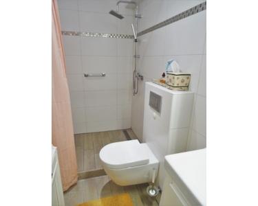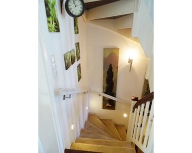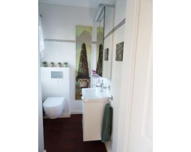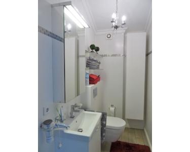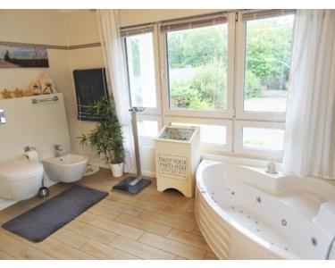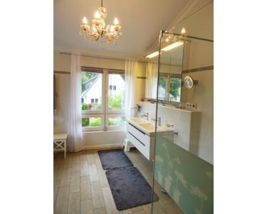 Ein großes Bad mit Whirlbadewanne, Bidet, WC, Doppelwaschtisch und bodengleiche große Dusche mit Regen/Schwall. Besonders erwähnenswert ist die Wäscherutsche in den Keller direkt neben die Waschmaschine und den Trockner. 300l Warmwasser werden über Solarpaneele auf dem Dach geheizt.