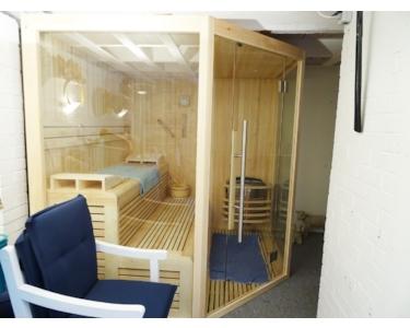 Die Garage beherbergt eine Falltreppe, die einen Dachboden freigibt auf der ganzen Fläche der Garage und Saunahauses. Extrem viel Stauraum zusätzlich.