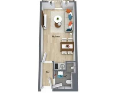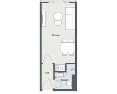 Dieses helle 1-Zimmer-Apartment befindet sich im Erdgeschoss eines Studentenwohnhauses. Beim Betreten gelangt man in den Flur, der ausreichend Platz für eine Garderobe und einen Schuhschrank bietet. Von hier aus sind das Bad und der Hauptwohnraum zugänglich.