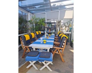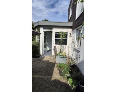 Das Haus hat einen Vorbau von ca. 9qm im Eingangsbereich und eine grosse überdachte Terasse hinter dem Haus und eine kleinere höher gelegene Terasse.