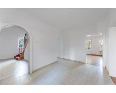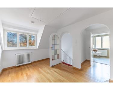 Das Haus überzeugt schon beim ersten Anblick mit seiner klassischen Architektur und der liebevoll bewahrten Handschrift vergangener Jahrzehnte. Im Inneren entfaltet sich ein besonderes Wohngefühl: Der großzügige Wohnraum mit Kamin und das charaktervolle alte Parkett laden dazu ein, den Alltag hinter sich zu lassen und entspannte Stunden im Kreis der Familie zu verbringen. Große Fenster öffnen den Blick in den Garten und schaffen eine harmonische Verbindung zwischen Innen und Außen.
