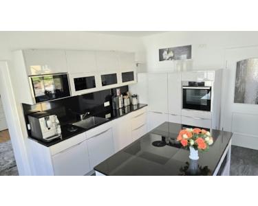 -Große, moderne Küche (18,59 m²) mit hochwertigen Geräten und Kochinsel inkl. Bora-Induktionskochfeld.