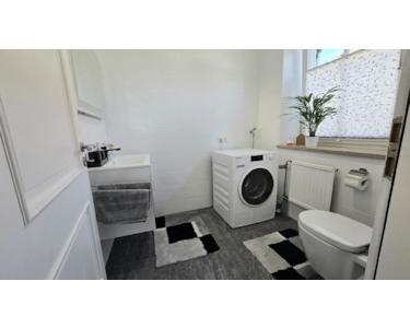 -Großes Gaste-WC mit neuwertiger Sanitärausstattung und modernem Fliesenboden.