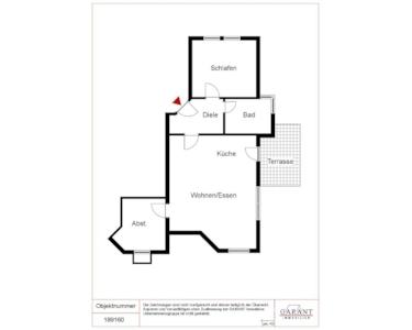 Wohnungsaufteilung: Diele mit Platz für Garderobe, hell gefliestes Badezimmer mit Fenster, offene Küche mit Wohn-/Essbereich und Zugang zur Terrasse und zum Garten, der zur Gemeinschaft gehört, Schlafzimmer und Abstellraum/Büro.
