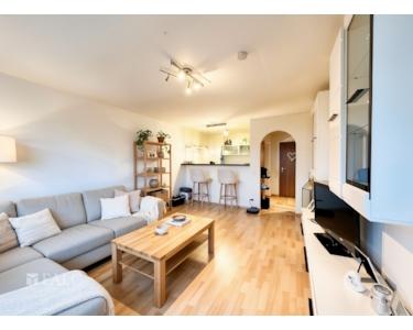Beim Eintritt in das Wohnzimmer fällt sofort das einladende Licht auf, das durch die Fenster strömt und den Raum mit natürlichem Tageslicht erfüllt. Der helle Laminatboden verleiht dem Wohnzimmer eine angenehme Atmosphäre und lässt es geräumiger wirken. Der Übergang zur offenen Küche schafft eine harmonische Verbindung von Wohn- und Kochbereich. Die Küche ist mit modernen, weißen Fronten und einem dunklen Arbeitsbereich ausgestattet, was einen eleganten Kontrast bietet.