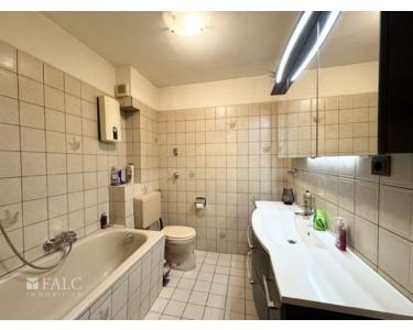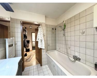 Das Badezimmer ist in hellen Fliesen gehalten, die dem Raum Frische und Klarheit verleihen. Es verfügt über eine praktische Badewanne und eine funktionale Ausstattung.