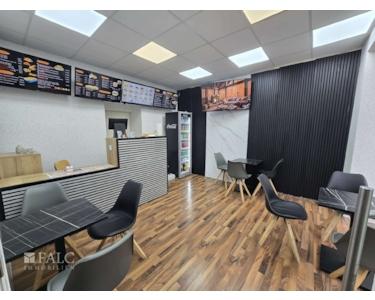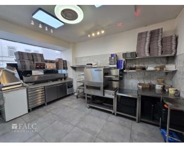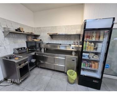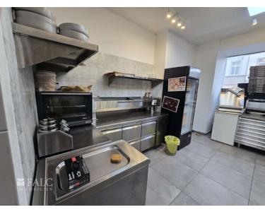 Zum Verkauf stehen zwei nebeneinanderliegende Ladenlokale an der Steeler Straße in Essen, jeweils ca. 50 m² groß. Eines der Lokale ist als moderne Küche mit vollständiger Ausstattung eingerichtet, das andere dient als Gastraum.