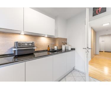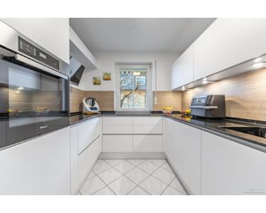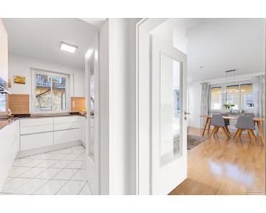 Die separate Küche ist modern ausgestattet und besticht durch hochwertige Markengeräte, darunter Miele. Zwei weitere Zimmer lassen sich flexibel als Schlafzimmer, Homeoffice oder Kinderzimmer nutzen – alle Räume wirken klar strukturiert, angenehm hell und äußerst gepflegt.