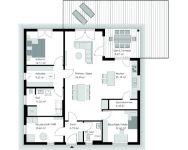 Ein überdachter Terrassenbereich ist eines der Highlights, die der Bungalow Fertighausentwurf 10 bietet. Eine quadratische Grundrissplanung bringt Vorteile mit sich. Alle Räume sind z. B. auf kurzen Wegen erreichbar. In der Planung wurde das Schlafzimmer mit Ankleide und Bad in einer Raumfolge angelegt. Direkt in der Nähe des Hauseingangs befindet sich das Gäste-WC, das optional auch als Duschbad realisiert werden kann. Ein zusätzliches Zimmer, das als Büro, Gäste oder Hobbyraum genutzt werden kann, bietet zusätzliche Flexibilität. Der Wohn-/Ess- und Kochbereich ist auf großzügigen 54,07 m² repräsentativ angelegt. Eine praktische Speisekammer ist neben der Küche geplant. Die Planung ist geeignet für Singles, Paare oder eine Kleinfamilie.