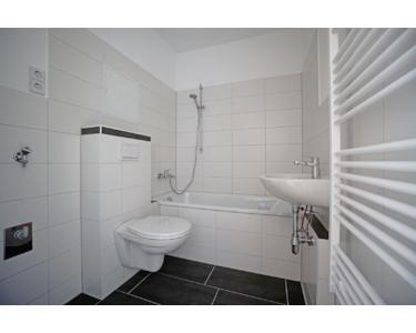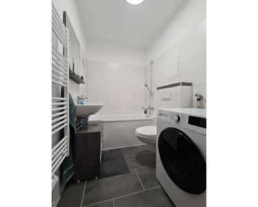 - modern gefliestes Wannenbad mit Waschmaschinenanschluss & praktischem Handtuchheizkörper