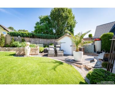 Die Außenanlage präsentiert sich ebenso gepflegt wie liebevoll gestaltet. Schon der Vorgarten setzt mit seiner harmonischen Bepflanzung, den gepflegten Wegen und stilvollen Akzenten einen geschmackvollen ersten Eindruck. Im hinteren Grundstücksteil öffnet sich der Garten zu einem wahren Highlight: Eine großzügige, elegant geflieste Terrasse bildet das Zentrum des Außenbereichs – ideal für sommerliche Feste, gemütliche Grillabende oder ruhige Stunden im Freien.