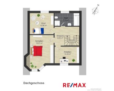 Im Dachgeschoss erwartet Sie eine einladende Empore, die in die privaten Rückzugsräume führt: ein helles Arbeitszimmer, ein großzügiges Kinderzimmer und ein ruhig gelegenes Schlafzimmer, das mit seiner behaglichen Atmosphäre überzeugt. Das edel ausgestattete Tageslichtbad mit Wanne und ebener Dusche wird höchsten Ansprüchen gerecht – ein Ort zum Entspannen und Wohlfühlen.