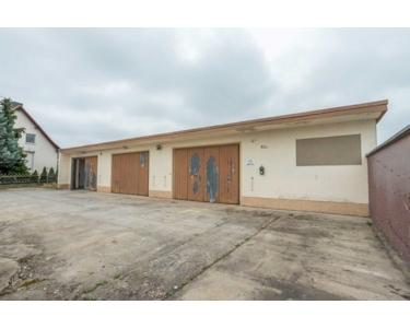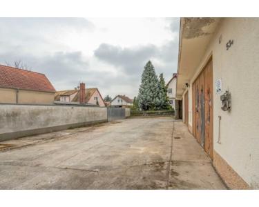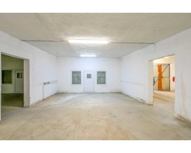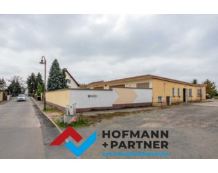 Auf dem vorderen Teil des Grundstücks befindet sich der voll umfriedete, durch ein großes Rolltor befahrbare Hof, an den sich die Halle anschließt. Das einstöckige Gebäude ist teilunterkellert und verfügt über eine große Halle, zwei Büroräume, einen Pausenraum, zwei Sanitärräume, Teeküche und zwei Lagerräume. Die Halle ist in drei funktionale Bereiche unterteilt. Der erste Bereich ist durch eine große doppelflügelige Tür befahrbar und eignet sich ideal für Anlieferungen oder als Garage. Die beiden weiteren Bereiche verfügen jeweils über Fenster und einen separaten Personenzugang zum Hof. Das gesamte Objekt wird über Nachtspeicheröfen beheizt. Die über eine separate Auffahrt befahrbare, befestigte und teilweise umzäunte Lager- und Parkfläche hinter der Halle bietet Platz für ca. 20 Pkw-Stellplätze.