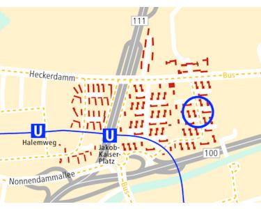 Die Wohnanlage liegt zwischen Heckerdamm, Jacob-Kaiser-Platz und Goerdeler Damm unweit der Autobahnanschlussstelle Heckerdamm und ist daher verkehrsgünstig gelegen. Ein guter Anschluss an den öffentlichen Nahverkehr (U-, S-Bahn und Bus) ist ebenfalls gegeben. Es gibt in der Siedlung zahlreiche Grünanlagen und Kinderspielplätze, der Jungfernheidepark und mehrere Kleingartenkolonien sind in unmittelbarer Nähe. Verschiedene kleine Einkaufszentren bieten eine gute Versorgung mit Dingen des täglichen Bedarfs, ein Waschhaus sowie mehrere Gästeappartements stehen zur Verfügung.