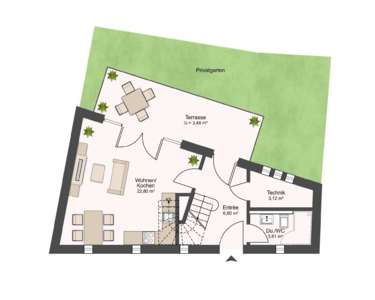 Im Erdgeschoss ist ein offener Wohn- und Essbereich vorgesehen, der direkten Zugang zur Terrasse und dem privaten Garten bietet – ideal, um die warmen Monate im Freien zu genießen. Das Obergeschoss bietet Platz für Schlaf- und Arbeitsräume, während im Dachgeschoss eine weitere Terrasse entsteht, die zum Entspannen mit schönem Ausblick einlädt. Der zum Grundstück gehörende Privatgarten schafft zusätzlichen Freiraum und lässt sich individuell gestalten – ob als grüne Oase, Familiengarten oder ruhiger Rückzugsort.