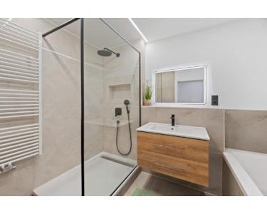 •Komplett erneuertes Bad mit Wanne und Regenschauer-Dusche in Unterputz-Optik