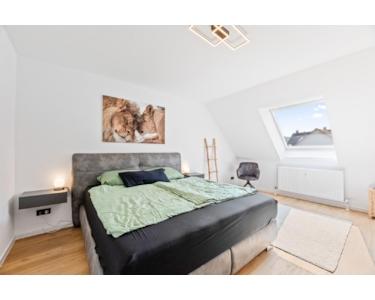 Die Wohnung besticht durch ihren modernen skandinavischen Stil mit klaren Linien, hellen Oberflächen und hochwertigen Materialien. Schwarze Akzente – von den Armaturen im Bad über Lichtschalter und Steckdosen bis hin zum Küchen-Spülbecken aus schwarzem Granit – sorgen für ein stilvolles, zeitgemäßes Ambiente.