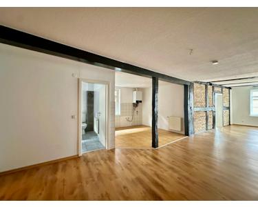 Die Wohnung im 1. Obergeschoss bietet ca. 80m² Wohnfläche und verfügt über einen großzügigen Wohn- und Essbereich mit offener Küche.