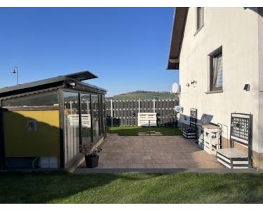Das Objekt umfasst Erd- und Dachgeschoss, zwei Terrassen, eine Garage sowie ein 964 m² großes, gepflegtes Grundstück. Ein zum Wintergarten umgebautes Gartenhaus erweitert die Nutzfläche sinnvoll. Die PV-Anlage sorgt für zusätzliche energetische Vorteile.