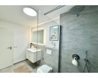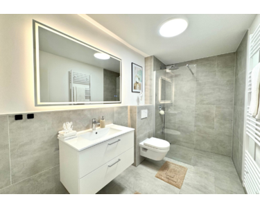 Das Badezimmer präsentiert sich ebenfalls komplett erneuert und auf dem neuesten Stand: Eine bodengleiche Regendusche, hochwertige Sanitärkeramik und moderne Materialien schaffen ein harmonisches, stilvolles Wohlfühlbad. Der nahezu barrierefreie Zugang rundet das komfortable Wohnkonzept ab.