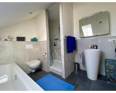 Im 2019 neu ausgebauten Dachgeschoss erwartet Sie Ihre persönliche Wellness-Oase mit einer großzügigen Sauna, einem weiteren Kaminofen im gemütlichen Ruhebereich, einer einladenden Büro-Ecke und einem zweiten, modernen Bad mit Dusche und Badewanne.