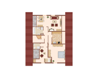 Die Wohnung hat eine gehobene und gepflegte Ausstattung; sie verfügt über zwei Bäder, wobei das Hauptbad über Wanne und Dusche verfügt, das zweite Bad hat eine Dusche. Die Wohnung ist in zwei Wohnbereiche unterteilt, beide Wohnbereiche haben jeweils eine Dachloggia. Im Wohnzimmer befindet sich ein Kamin. Die bauliche Ausstattung entspricht dem Baujahr. Zur Wohnung gehören ferner eine Garage und ein Kellerraum.