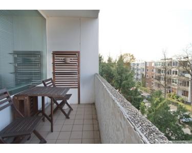 Wohnschlafraum mit Parkettboden, Internetzugang und TV Magenta L sind in der Miete enthalten. Wohnbereich mit Sofa und TV, das Bett ist durch einen Schrank und ein Regal räumlich abgeteilt. Am Fenster gibt es einen Schreibtisch mit Stuhl und direkten Zugan zum Balkon mit Tisch und Stühlen. Die komplett ausgestattete Küche ist sehr modern, mit Kühlschrank und Eisfach, Kochfeld mit Dunstabzug, Backofen, Microwellen-/Dampfgargerät, Toaster, Geschirr usw. Zur Wohnung gehört ein schönes Bad mit Wanne und Duschvorrichtung mit Glastrennwand, Handtuchheizung und großem Spiegel.