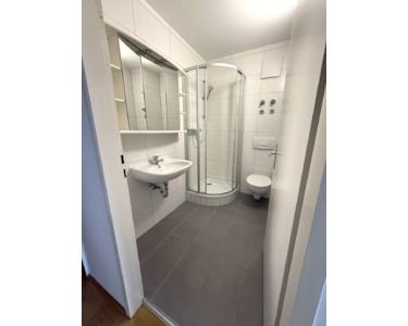 Das moderne Badezimmer ist mit einer Dusche, einem WC und einem neuen Waschbeckenschrank ausgestattet