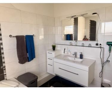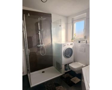 Das Badezimmer überzeugt mit einer Eckbadewanne; die 2021 neu eingebaute, begehbare Dusche mit transparenten Glaswänden lässt den Raum offen wirken und nimmt dem Bad keinerlei Licht oder Fläche. Ebenfalls 2021 wurde eine leistungsstarke Klimaanlage installiert, die die gesamte Wohnung angenehm kühlt. Die Beheizung erfolgt über eine Gasetagenheizung.
