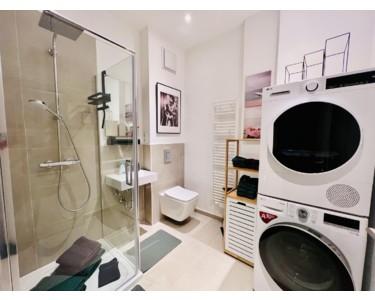 •Modernes, innenliegendes Duschbad mit Waschmaschine