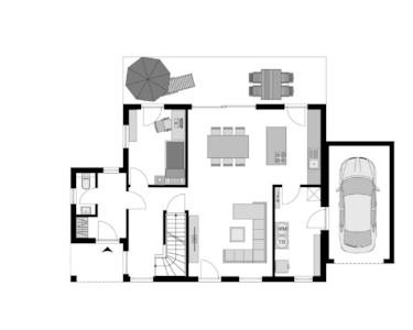 Die Architektur des Einfamilienhauses wird durch eine Wohnraumerweiterung mit überdachtem Hauseingang modern akzentuiert. Die Garage ist mit einem praktischen Nebeneingang zum Hauswirtschafts-/Haustechnikraum geplant, so können die Einkäufe oder schmutzige Sportsachen direkt beim Betreten des Hauses im Hauswirtschaftsraum verbleiben. Der Hauswirtschafts-/Haustechnikraum ist neben der Küche angeordnet. Der großzügige Wohn-/Ess- und Kochbereich ist offen gestaltet, der Wohnbereich ist so angelegt, dass die Küche nicht direkt einsehbar ist. Eine große Panorama-Hebeschiebetür, zwei Terrassentüren und ein Fenster sorgen für ein lichtdurchflutetes Ambiente.