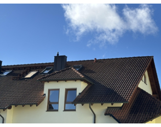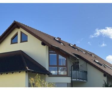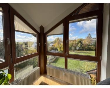 Die Fenster bestehen aus Holz und Kunststoff; neue Dachfenster mit Solar-Außenrollos seit 2019 und neue Erkerfenster seit 2022.