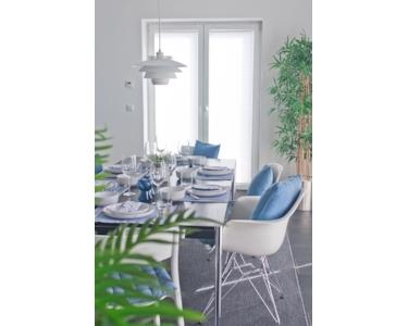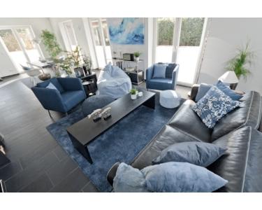 Zudem gewährleisten die doppelflügeligen Terrassentüren in nahezu allen Räumen – einschließlich der Schlafräume im Obergeschoss, dort mit französischem Balkon – stets lichtdurchflutete Zimmer.