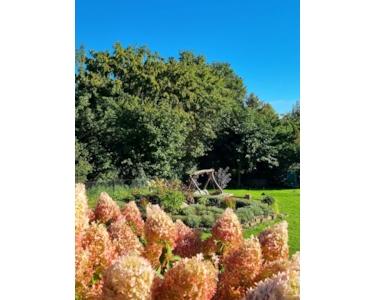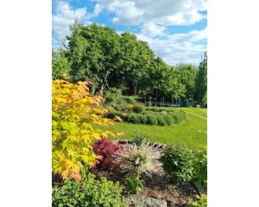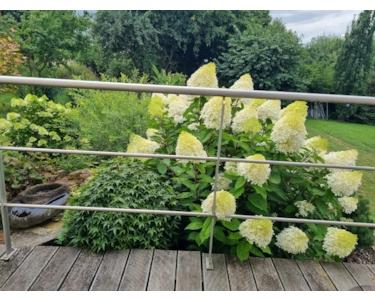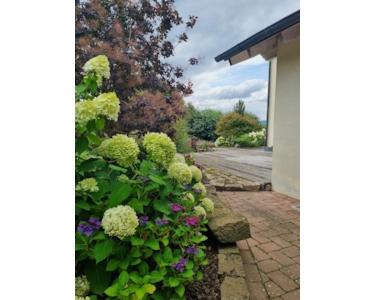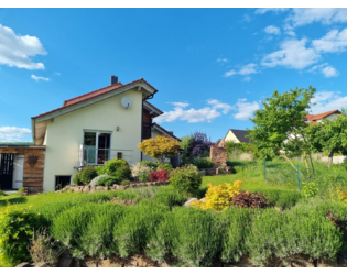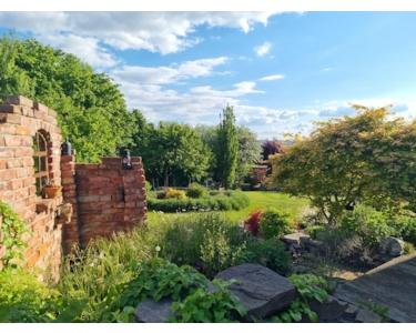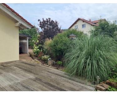 Daneben gibt es einen weiteren PKW-Stellplatz. Einfahrt, Stellplätze und Schuppen sind gepflastert. im südlichen Bereich des Gartens mit leichter Hanglage wurde 2020 ein Freisitz angelegt. Hier kann man die Abendsonne genißen. An der westlichen Gebäudeseite erreicht man über den Garten einen ca. 20 m² großen Geräteschuppen, der 2024 gebaut wurde. Hier ist reichlich Platz für Gartengeräte. im Schuppen befindet sich außerdem ein Hauswasserwerk. Eine Wasserleitung ist bis zur Terrasse der Südseite verlegt. Der Regenrückhaltebehälter wurde beim Bau größer als gefordert gewählt und gewährt so mehr als 1.500 Liter Regenwasser zur Gartenbewässerung. Alle Dachrinnen sind aus Kupfer. Das Grundstück schließt lediglich im Westen an ein Nachbargrundstück an. Östlich und südlich befinden sich keine unmittelbaren Nachbargrundstücke. Da sich an der Nordseite der Grundstücksgrenze die öffentliche Straße befindet, besteht im Winter keine Räumpflicht von Gehwegen. Der Garten ist sehr liebevoll, jedoch möglichst pflegeleicht angelegt. Die bepflanzten Beete sind zum Teil mit Rindenmulch, zum anderen Teil mit wasserdurchlässigen Lavasteinen gegen übermäßigen Unkrautwuchs gesichert. Beim größten Teil der Bepflanzung wurde großen Wert auf Bienen- und Insektenfreundlichkeit gelegt. Direkt an der Natursteintreppe von der Terrasse in den Garten befindet sich ein kleiner Teich mit Wasserfall.