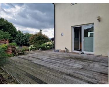 Der liebevoll angelegte Garten mit überschaubarem Rasenanteil ist nach Süden ausgerichtet. Diesen erreicht man entweder vom Wohnbereich über die ca. 35 m² Holzterrasse aus Hartholz oder durch den Kellereingang an der Südseite des Hauses. Im Sommer ist die Terrasse vom Fußweg aus, der komplett an der Ostseite des Grundstücks verläuft, kaum einsehbar. Ebenfalls an der östlichen Gebäudeseite schließt direkt an das Haus ein Carport mit abschließbarem Fahrradschuppen an.
