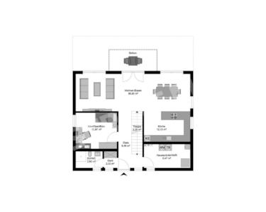 Im Erdgeschoss bildet der offen gestaltete Wohn-, Ess- und Kochbereich mit 49 m² das Herzstück des Hauses.