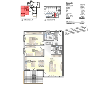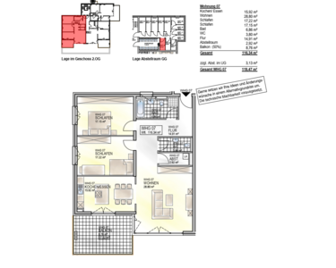 Das Angebot bezieht sich auf die Wohnung 4 im 1. Obergeschoß - hangseitig 2. Obergeschoß. Sie gelangen über eine geräumige Diele mit Garderobe in die Wohnung. Von der Diele gelangen Sie in das geräumige Bad mit Fenster von ca. 8 m² ausgestattet mit Dusche und Wanne, das gut aufgeteilte Elternschlafzimmer von ca. 17 m², das helle geräumige Kinderzimmer/Büro von ca. 15 m², das Gäste-WC sowie in den Abstellraum. Von der zentralen Diele gelangen Sie desweiteren in den hellen großzügigen Wohn/Eßbereich mit offener Küche von insgesamt 48 m² und Ausgang auf den großen sonnigen Balkon von ca. 18 m². Von hier haben Sie eine herrliche Sicht ins Tal und über die Stadt Koblenz. Der Kochbereich kann auf Wunsch abgetrennt werden. Die Wohnung hat eine Wohnfläche von ca. 117 m². Der Wohnung ist ein Kellerraum zugeordnet.
