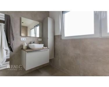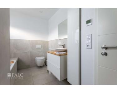 Auch das 2. Obergeschoss verfügt über Laminatboden. Hier befinden sich ein großzügiges Schlafzimmer mit direktem Zugang zum großen Balkon sowie ein weiteres Tageslichtbad mit Walk-In-Dusche, Waschbecken mit Unterschrank, WC und Handtuchwärmer. Ein zusätzlicher Hochschrank bietet Platz für Handtücher und Badeutensilien.