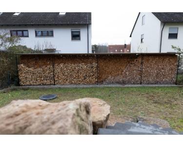 Die Grundstücksgrenze ist mit einem optischen Highlight und gleichzeitigen smart nutzbaren Holzlagerunterstand, welcher gleichzeitig einen hervorragen Sichtschutz bietet eingefriedet.