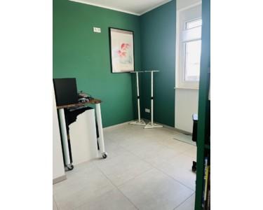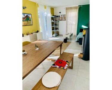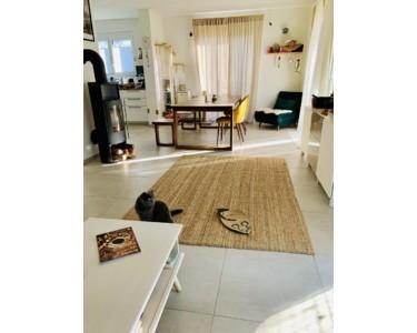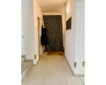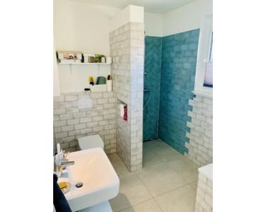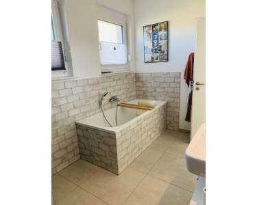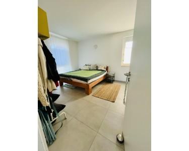 Im Inneren überzeugt das Haus durch eine moderne, offene Raumgestaltung. Im Erdgeschoss befinden sich ein Hauswirtschaftsraum, ein Gäste-WC, die Küche mit Einbauküche aus dem Jahr 2021 und der großzügige Wohn- und Essbereich, der direkten Zugang zur Terrasse bietet. Ein praktischer Abstellraum unter der Treppe ergänzt das Platzangebot. Im Obergeschoss liegen das Schlafzimmer, ein Kinderzimmer, ein Büro sowie das Badezimmer mit ebenerdiger Dusche und Badewanne. Alle Räume sind einheitlich mit großen, modernen Fliesen ausgestattet. Ein zusätzlicher Dachboden bietet weiteren Stauraum.