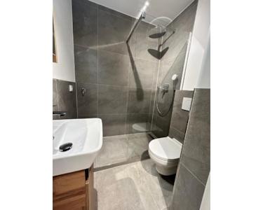 Das geschmackvoll modernisierte Badezimmer überzeugt mit einer großzügigen Dusche, einem eleganten Spiegelschrank und einem passenden Badunterschrank. Der helle Wohn- und Schlafbereich bietet dank der großen Fensterfronten eine freundliche, einladende Atmosphäre und Zugang zum sonnigen Balkon – ideal zum Entspannen nach einem langen Tag.