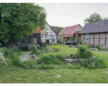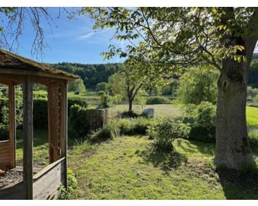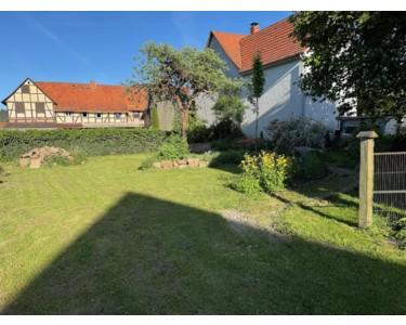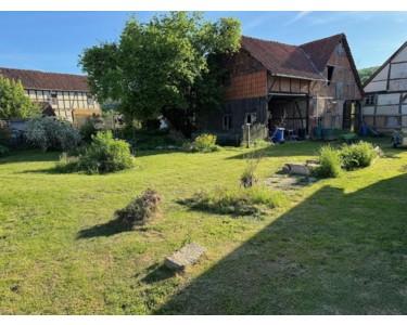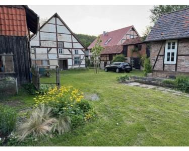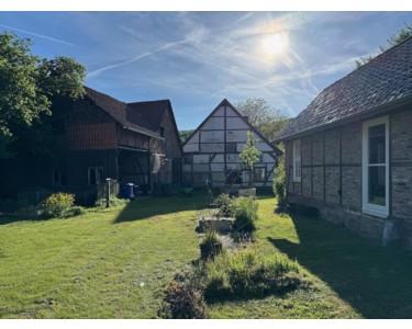 Der historische Vierseithof liegt am ruhigen Ortsrand, nur hundert Meter von der Weser entfernt, mit unverbaubarem Blick auf den Reinhardswald. Das weitläufige Anwesen umfasst ca. 1.700 m² Bauland plus zwei Wiesenparzellen (600 m² Obstwiese direkt gegenüber, 1.200 m² Wiese 500 m entfernt, derzeit verpachtet).