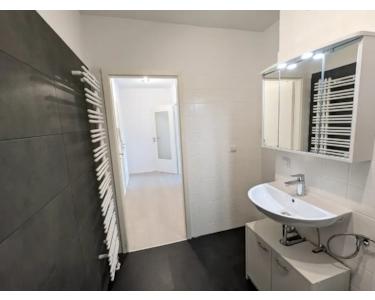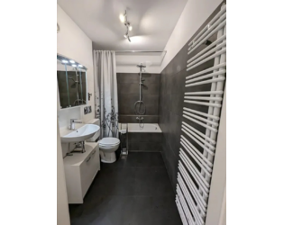Das Badezimmer verfügt über eine neue Badewanne, Toilette, Waschbecken, Regendusche und Badezimmermöbel. sowie einen beheizbaren Handtuchhalter. Die Anschlussmöglichkeit für Waschmaschine und Trockner runden das Bad ab und machen es zu einem echten Highlight der Wohnung.