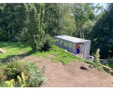 • 2 Kaminöfen (mit Wärmespeichersteinen) mit Außenschornsteinen im