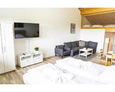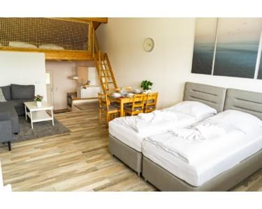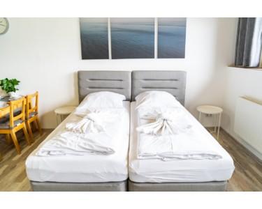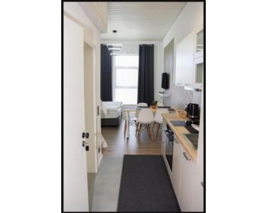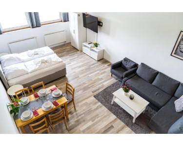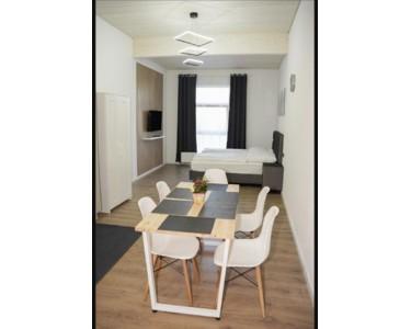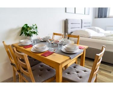 Alle Apartments sind vollständig möbliert und ausgestattet mit Doppelbett/Boxspringbett, Schrank, Esstisch und Stühlen, TV, moderner Einbauküche (Herd, Backofen, Kühlschrank, Wasserkocher, Toaster, Geschirr und Grundausstattung) sowie eigenem Badezimmer mit Dusche. WLAN und Parkplatz sind im Preis enthalten.
