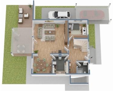 Wohn-/Esszimmer. Der rund 34 m² große Wohnbereich besticht durch große, bodentiefe Fensterelemente, die einen wunderbaren Blick in den angrenzenden Garten sowie auf die teilüberdachte Terrasse ermöglichen. Direkt neben dem Essbereich befindet sich die Küche, die kurze Wege im Alltag garantiert.