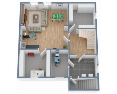 Ergänzt wird das Erdgeschoss durch ein Tageslichtbad mit Dusche und ein weiteres Zimmer, das sich als Schlaf-/ oder Arbeitszimmer nutzen lässt.